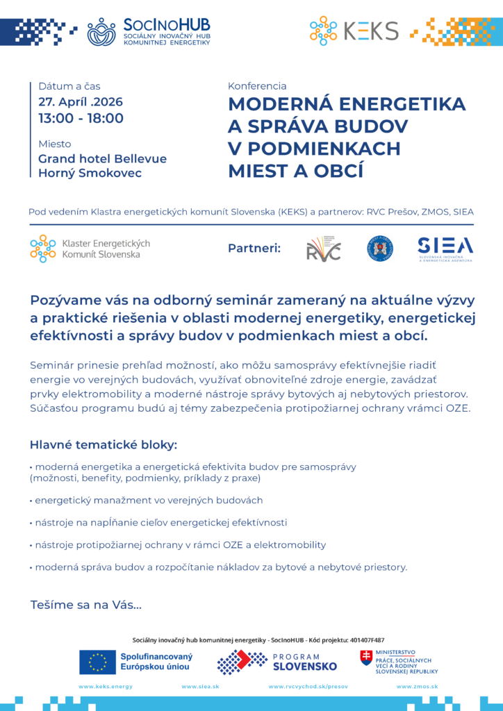 Pozývame vás na odborný seminár zameraný na aktuálne výzvy a praktické riešenia v oblasti modernej energetiky, energetickej efektívnosti a správy budov v podmienkach miest a obcí.